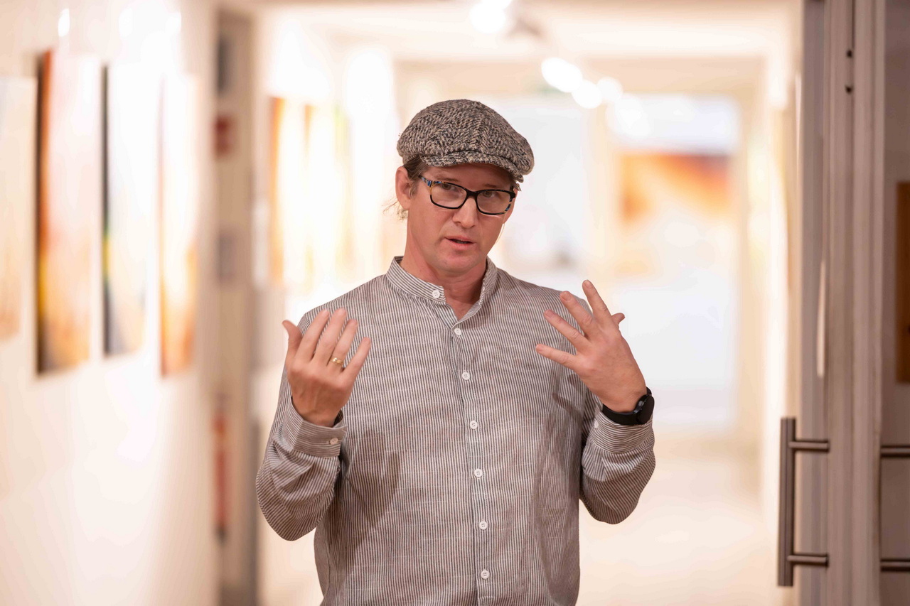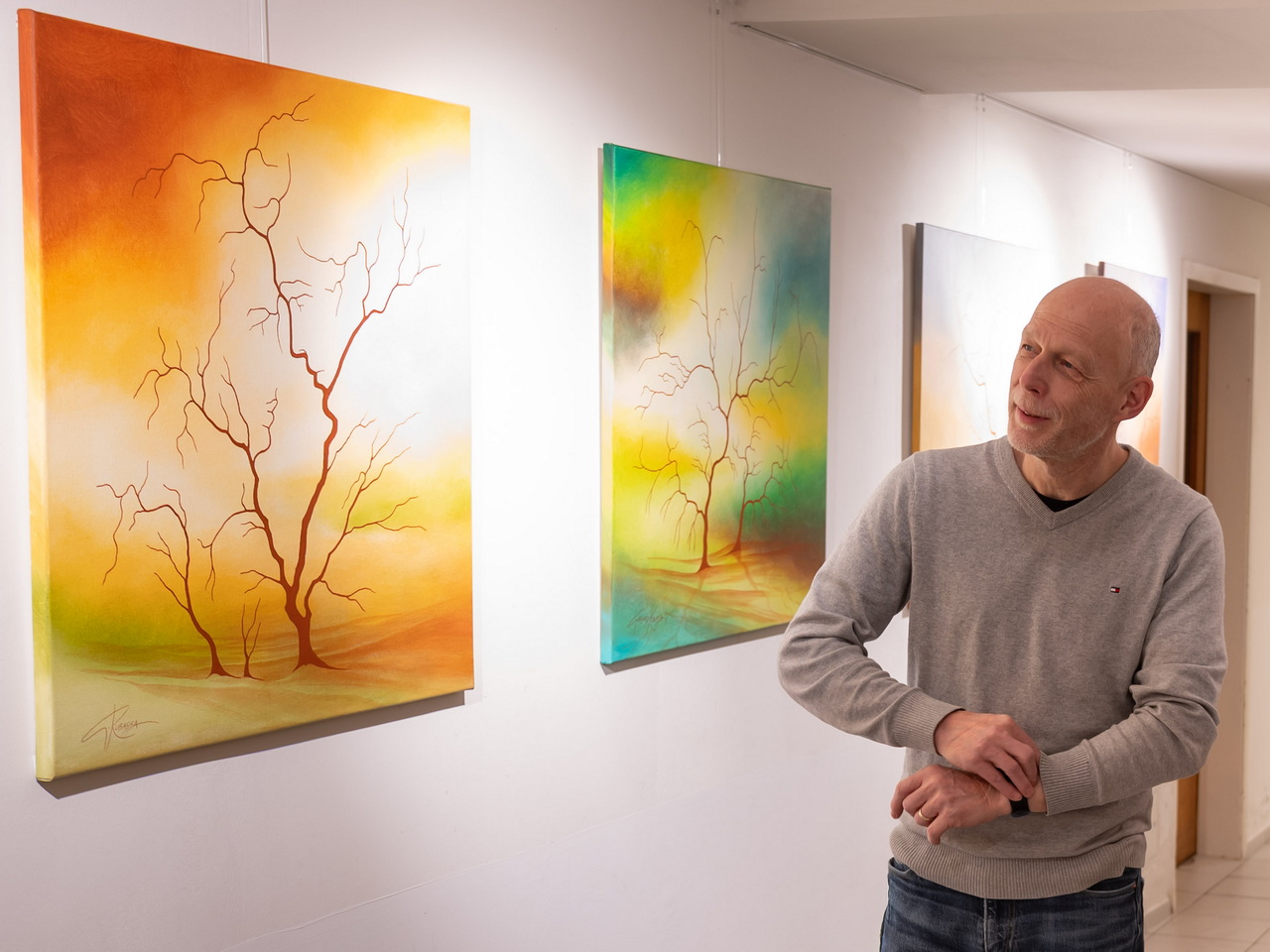 Unsere Kurs- und Einzelgäste werden in den kommenden Wochen viel Gelegenheit haben, genauer zu schauen. Denn das muss man. Man muss in diesen Bildern auf Entdeckungsreise gehen, um sie erst richtig zu sehen. „Wird dem nicht langweilig, immer nur Bäume zu malen?“ war die erste Reaktion einer Mitarbeiterin, bis ihr der Schlüssel zu den vielfältigen Gestalten, die sich in diesen Baumlandschaften verbergen, aufleuchtete. Es ist eine Reduktion auf Linien und Konturen, die Gefühlswelt hinter den Figuren findet ihren Ausdruck in der Farbgebung der angedeuteten Landschaft.